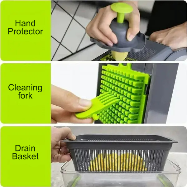 Komplektā iekļautais roku aizsargs pasargā jūsu pirkstus no visiem 7 nerūsējošā tērauda asmeņiem – tāpēc varat spiest ar pilnu spēku un katru reizi iegūt tīrus, vienmērīgus griezumus.