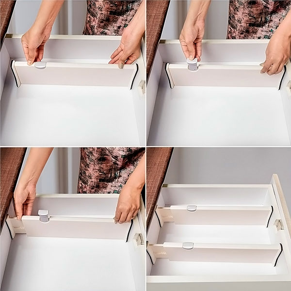 Neatkarīgi no tā, vai runa ir par virtuves piederumiem, vannas istabas tualetes piederumiem vai zeķēm guļamistabā – šos sadalītājus var regulēt no 28 cm līdz 45 cm, lai tie atbilstu lielākajai daļai atvilktņu. Jūs varat pielāgot savu telpu tieši tā, kā nepieciešams.
