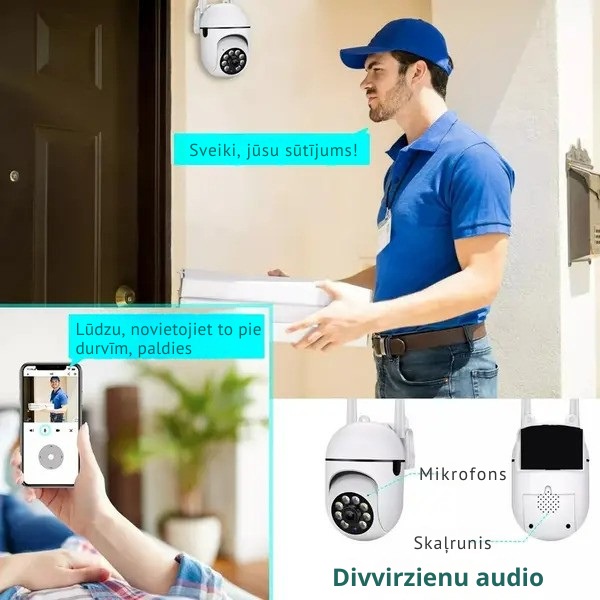 Āra drošības kamerā iebūvētais mikrofons reaģē ātri, un jūs varat klausīties un runāt caur to, izmantojot mūsu aplikāciju. Divvirzienu audio sistēma ļauj jums sazināties ar jūsu draugiem vai ciemiņiem, un kustības detektors var palīdzēt jums tikt vaļā no nelūgtiem viesiem vai dzīvniekiem.