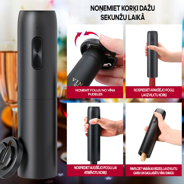Ar vienu pogas nospiešanu noņemiet jebkuru korķi dažu sekunžu laikā, lai jūs varētu vairāk laika veltīt vīna baudīšanai un mazāk cīnīties ar pudeli.