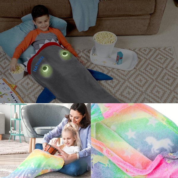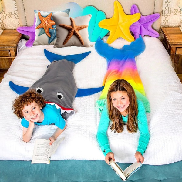 Mīksts, augstas kvalitātes flaneļa vilnas audums nodrošina bērniem siltumu, kamēr viņi atpūšas pēc skolas vai pārgulstas uz nakti. Tā ir ideāli piemērota, lai ērti pagulētos uz dīvāna, skatoties multiplikācijas filmas, vai arī lai sildītos aukstos vakaros. Jūsu bērni ķiķināsies no prieka, kad viņi savilksies vai nu haizivs, vai nāras astē.