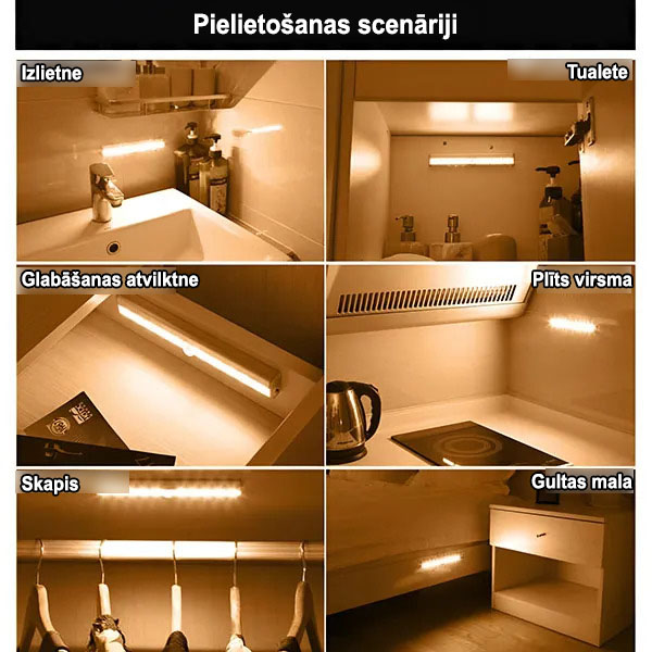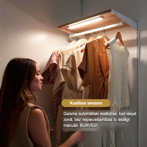 Atvieglojiet ģērbšanos, ievietojot šo gaismu savā garderobē vai skapī. Tā automātiski iedegas, kad atverat durvis, palīdzot jums atrast drēbes, nesapņojot tumsā.