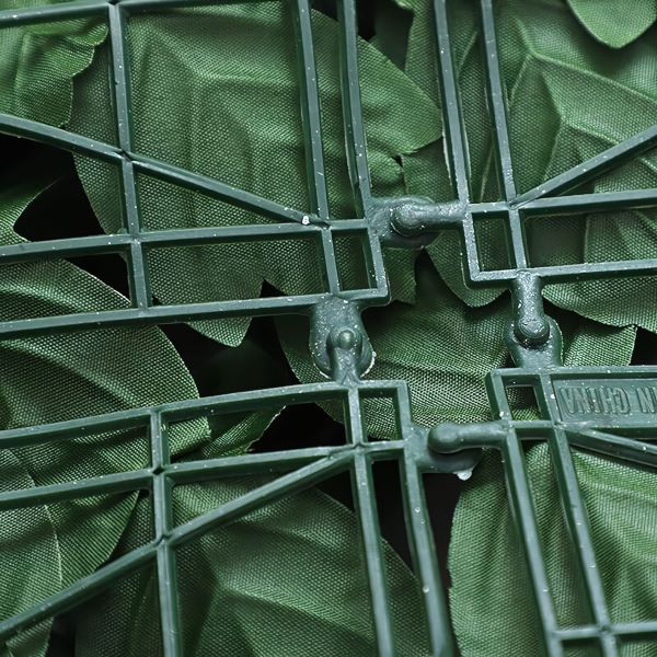 Mākslīgo zaļo lapu panelis tiek uzstādīts, ievietojot plastmasas mietiņu caurumā citā plastmasas daļā.