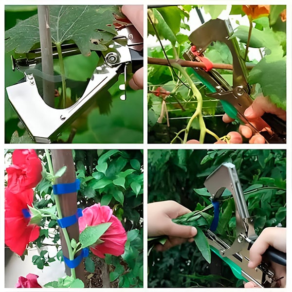Vienkārši nospied rokturi, lai izstieptu siksnu starp knaiblēm. Tad lenti aptin ap augu, kuru vēlies piesiet. Vēlreiz nospied rokturi, lai pievilktu un nogrieztu lenti. Ļoti viegli – nav jāuztraucas par augu sabojāšanu vai sāpju rašanos, jo lente un skavotājs nodrošina maigu, bet stingru satvērienu.